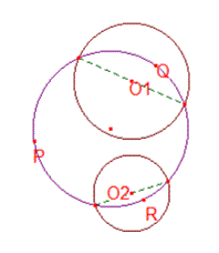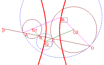 命題3-16より,$Q$を中心とする半径$QR$の円および$R$中心とする半径$RA$の円が2円$O_1,O_2$に接する.ここでは点$P$を円$O_1,O_2$の中心を結ぶ線分を半径の比に外分する点を取ったが,内分する点を取っても同様のことが成り立つ(右下図).