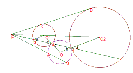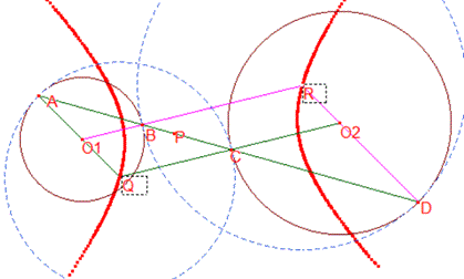 したがって点$P$は2円$O_1,O_2$の相似の中心である.