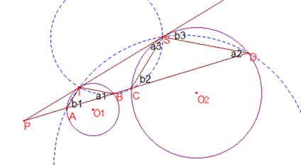 次に,2点$A,B$と円$O_1$が与えられたとき,$A,B$を通り円$O_1$に接する円$O$が作図できたと仮定する.これは後で示すが.この円が円$O_2$にも接することを示す.