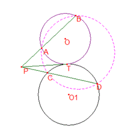 $P$から円$O$に引いた接線を$PT$とすると,$P$を中心とする半径$PT$の円は円$O$
