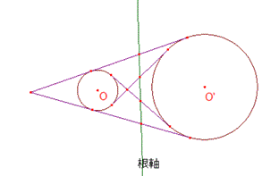 片方の円がもう一方の円に含まれるときは後で述べる(根心の性質を用いる).