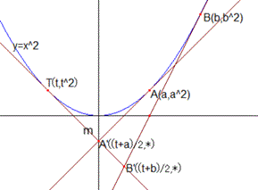 証明中心が$P_1$の線束から中心が$P_2$の線束への配景でない射影写像を$f$とする. 直線$P_1P_2$を$l$,$f$による$l$の像を$m$,$f$による$n$の像が$l$とする. すなわち $f:l\mapsto m,n\mapsto l$ $P_1$が中心の線束を$\{l,n,l_3,l_4,\cdots\}$, $P_2$が中心の線束を$\{m,l,m_3,m_4,\cdots\}$とする. $m,n$の交点を$Q$, $f:l_3\mapsto m_3$ とし,$l_3,m_3$の交点を$E$とする. 射影座標系を$[P_1,P_2,Q;E]$とし,$P_1$を通る任意の直線$l_4$とその$f$ の像$m_4$の交点の座標を求める. 先ず $\{l,n,l_3,l_4\}\barwedge \{m,l,m_3,m_4\}$ であることに注意する. $P_1(1,0,0),P_2(0,1,0),Q(0,0,1),E(1,1,1)$ である. $l_3(0,1,-1),m_3(1,0,-1)$ である. このとき $l_3=-l+n$ $m_3=m-l$ さらに, $l_4=-bl+an$ $m_4=-dm+cl$ とすると $[l,n;l_3,l_4]=[m,l;m_3,m_4]$ より, $\dfrac{b}{a}=\dfrac{d}{c}$ したがって $m_4=-bm+al$ $l_4,m_4$の射影座標は $l_4=-bl+an=-b(0,0,1)+a(0,1,0)=(0,a,-b)$ $m_4=-bm+al=-b(1,0,0)+a(0,0,1)=(-b,0,a)$ より$l_4,m_4$の交点$X$の座標は $(0,a,-b)\times (-b,0,a)=(a^2,b^2,ab)$ $X$の方程式は $z^2=xy$ である.これは射影座標系$[P_1,P_2,Q,E]$における方程式であり2点$P_1,P_2$を通る. この命題より,2つの異なる点を中心とする線束間の配景でない射影変換の対応直線の交点の軌跡が 2次曲線であることがわかった.$\blacksquare$ なお,2つの異なる点を中心とする線束間の配景変換の対応直線の交点の 軌跡は直線になり,この場合は退化するとして,2次曲線の 特別な場合として扱う.これは次のページで議論する. 3.退化する2次曲線 射影幾何の目次 全体の目次 |